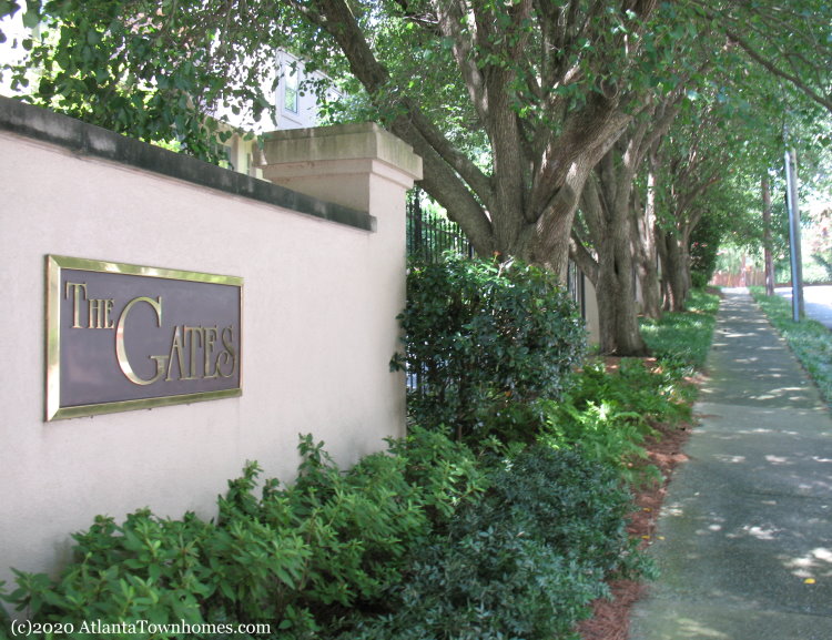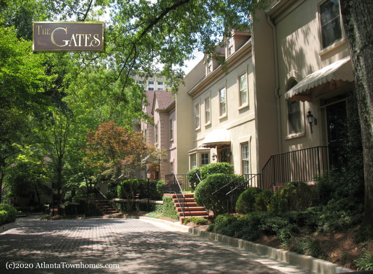 The Gates is a small community of 32 stucco exterior townhomes located in Buckhead,Atlanta GA built 1982.  Community has a daily on site manager.  The Gates has various 2-story townhomes with 2-5 bedrooms, 2 car garages, fenced in courtyards.  Some with additional basement, elevator.  Expect 9 foot ceilings with crown molding, hardwood floors, separate formal dining room, fireplace, over sized master bedroom, garden tub with separate shower in the master bath.  Many townomes in The Gates have been luxuriously renovated with new upscale kitchens and baths.  One of Atlanta’s most desired communities!