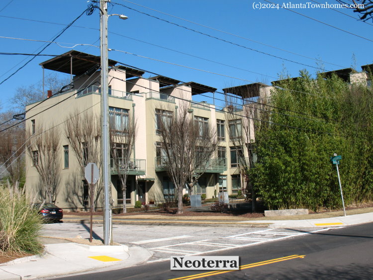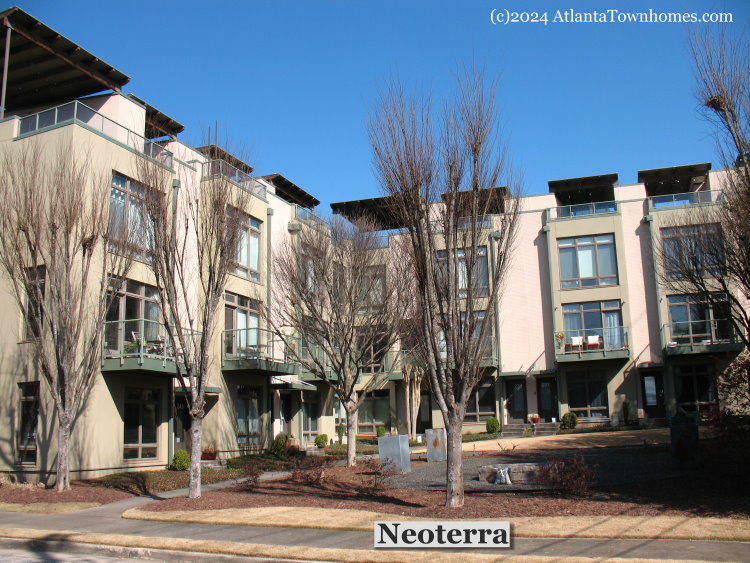 Neoterra is a small community of 9 contemporary townhomes in Lake Claire Atlanta, GA built 2006-2007. 3 bedroom, 3 bath floor plans with 1 or 2 car garages. Each townhome has a covered rooftop terrace with Atlanta skyline views. Eco-friendly touches like bamboo flooring, parawood cabinets, and wheatcore doors were the norm when built.